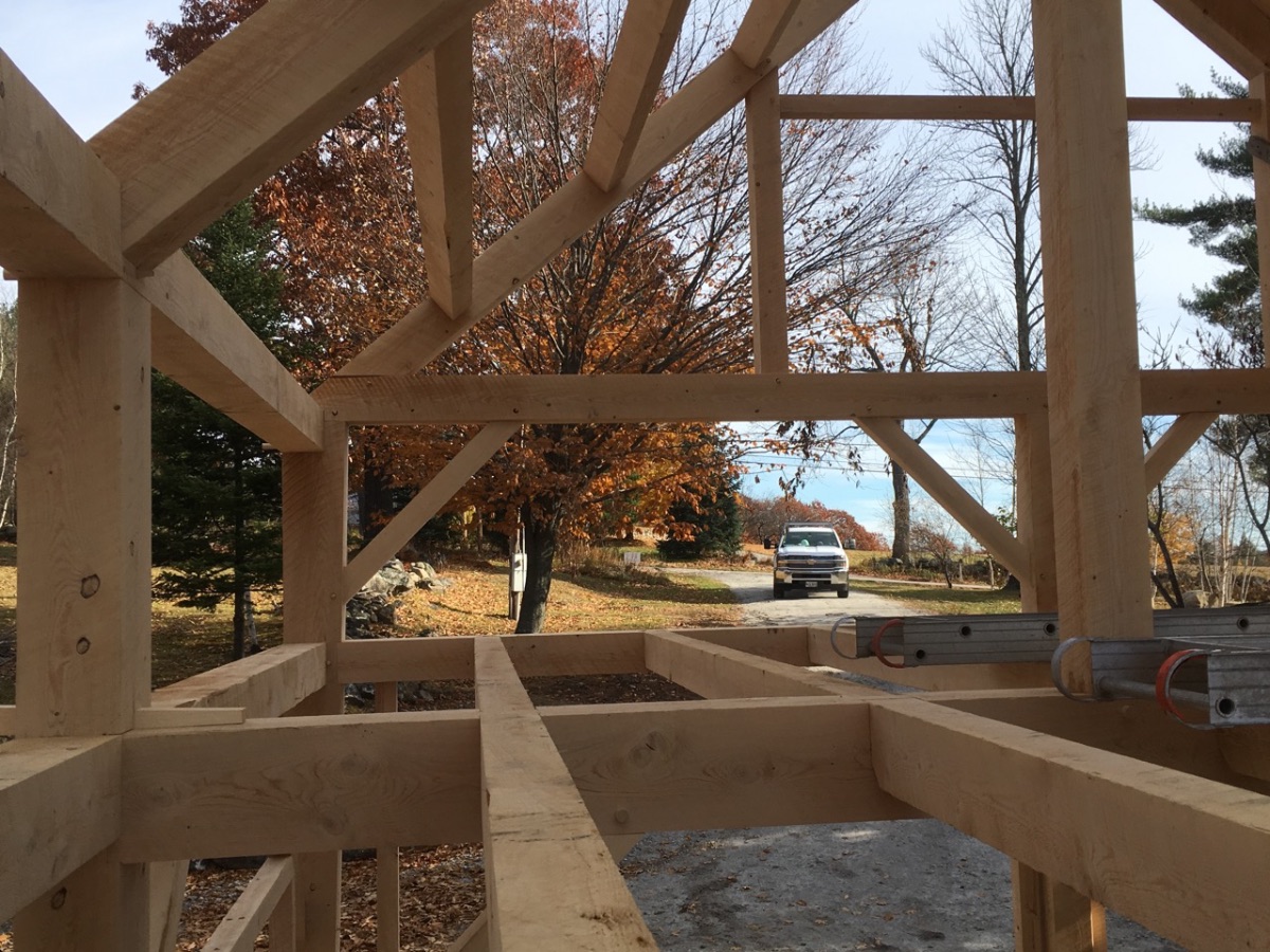 26’ x 26’ Carriage Barn. Classic dropped tie frame. (Wedged dovetail tying joint at interior bent) English Tying joint at gables.
