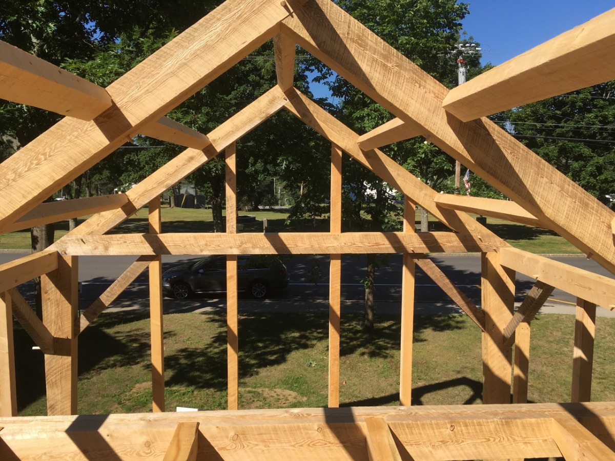 This is a 16’ x 20’ Hemlock and Oak frame we recently designed, cut and assembled for the Bethel Historical Society. It is a replica of Dr. Mason’s office/lbrary that once stood on the historical society’s property. The frame showcases two methods of tying a building together, the english tying joint and a wedged dovetail. The frame will be left exposed on the interior and used as a teaching space.